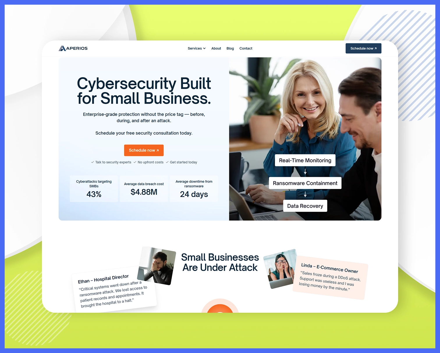 A complete website redesign and development project for Aperios, Cybersecurity for small business.